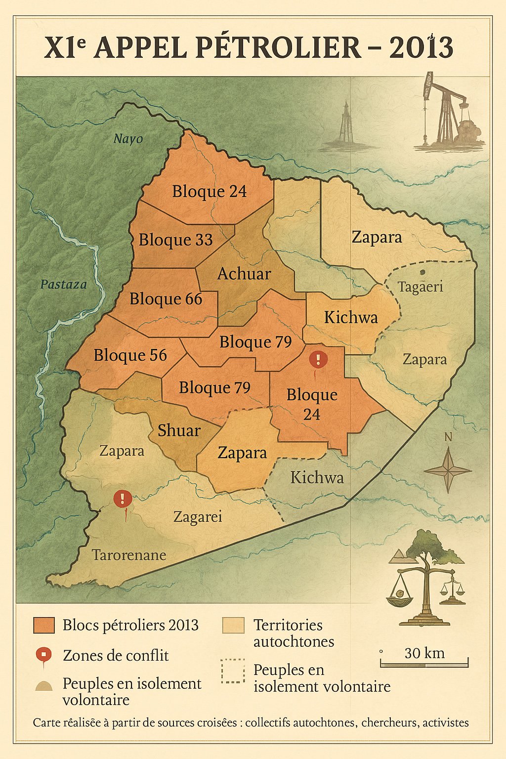 La carte originelle, désormais restaurée, illustre ce que l’on appelle la « Nueva Ronda Petrolera » — une nouvelle vague de concessions pétrolières en Équateur. En 2012, l’État équatorien a découpé d’immenses portions de forêt pour les mettre aux enchères auprès de compagnies étrangères.